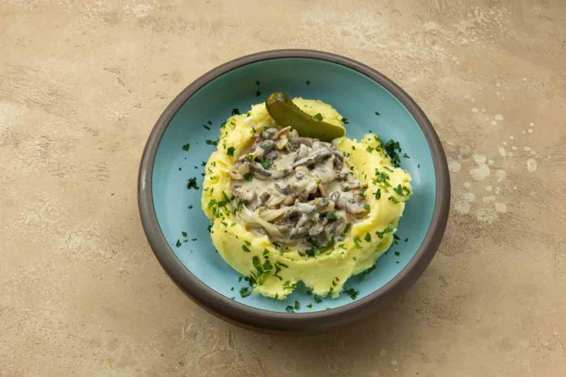 пюре картофельное , вырезка говяжья , шампиньоны, сливки , соленые огурцы