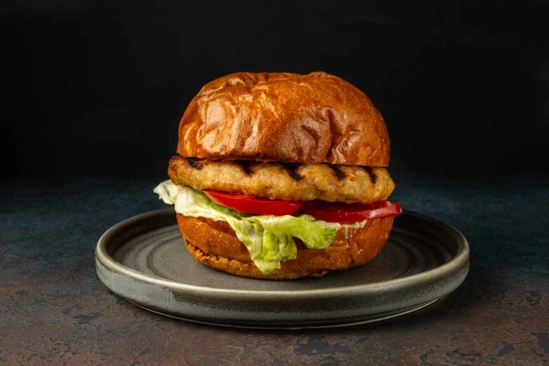 булочка, куриная котлета, свежие овощи, соус цезарь, соус спайси
