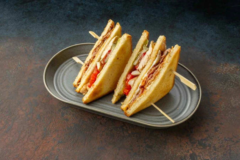 тостовый хлеб, свежие овощи, куриное филе, яйцо и бекон