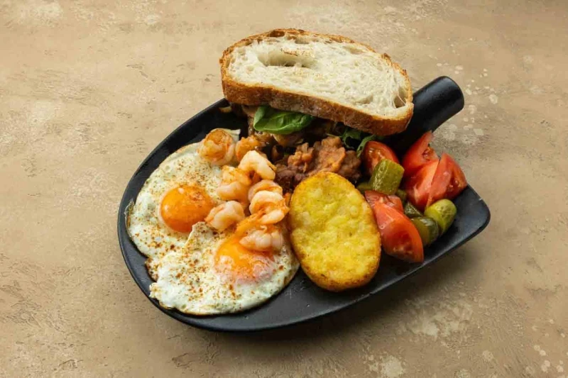 яйцо куриное, фасоль, хашбраун, помидоры, огурцы соленые, пшеничный тартин, креветки, грибы шампиньоны